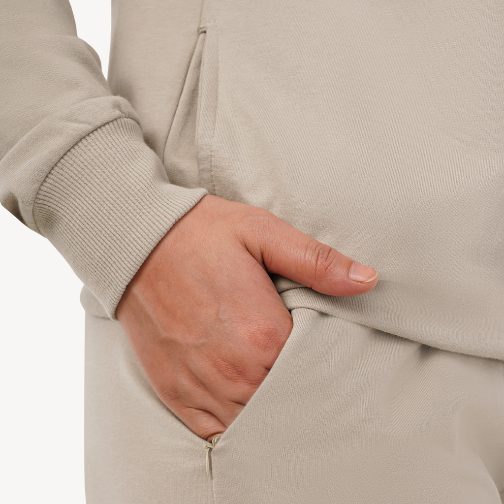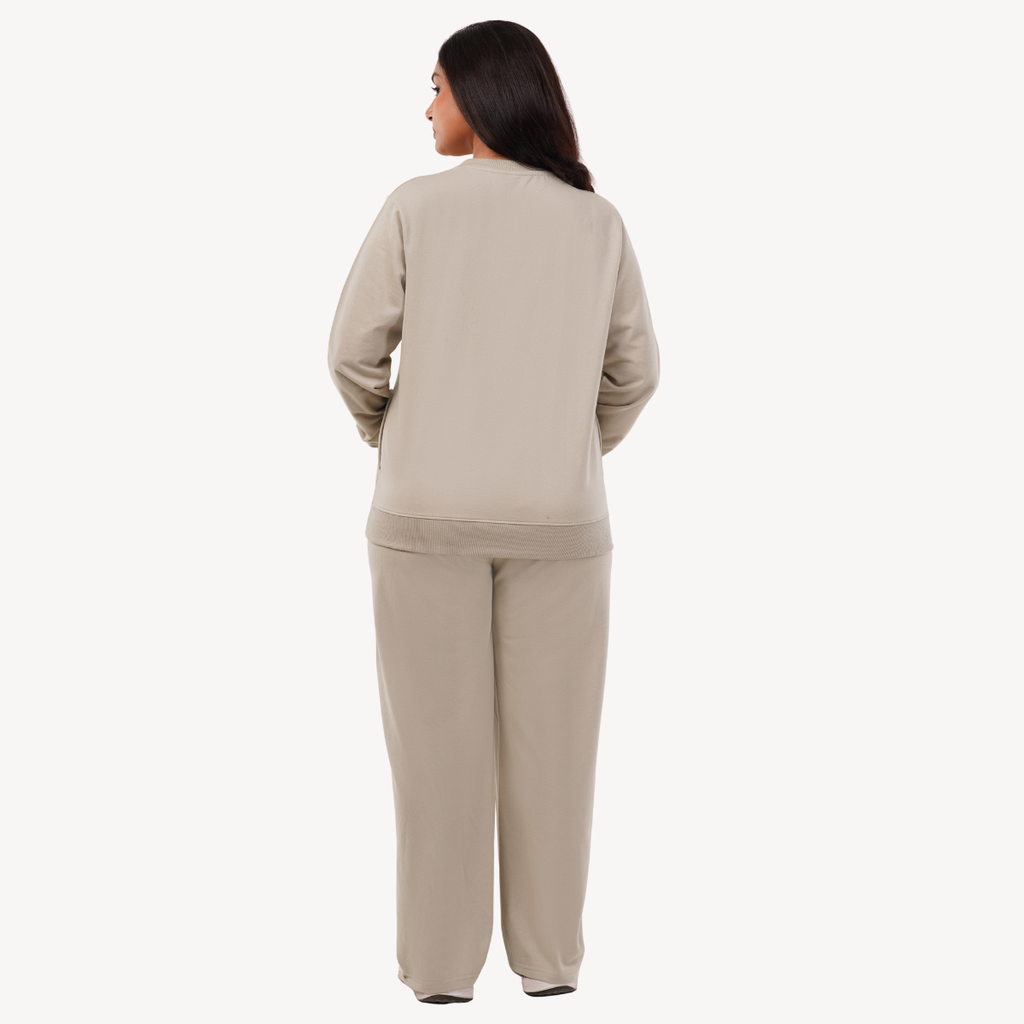The Biscotti Beige Co-ords Set is fashioned from ultra-soft premium cotton, ensuring comfort and flexibility throughout the day. This set features a breathable sweatshirt with a relaxed fit, paired with pants that include hidden pockets and an adjustable drawstring for a secure, personalized fit. Designed for longevity and easy care, it effortlessly merges practicality with style. Ideal for casual activities or downtime, the Biscotti Beige Co-ords Set is a reliable and stylish addition to any wardrobe, offering lasting quality and refined comfort in a cohesive ensemble.