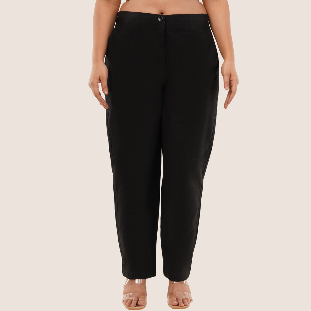These black wide cotton-linen pants offer a perfect balance of comfort and professionalism for office wear. Crafted from strong, lightweight, and breathable fabric, they feature a straight fit with a 2-inch waistband. The half-elasticated waist includes drawstrings and two buttons, complemented by a zipper fly for an adjustable, secure fit. Side slits at the bottom enhance ease of movement, and two pockets add practicality. Designed for durability and style, these pants are an excellent choice for a refined yet comfortable office look.