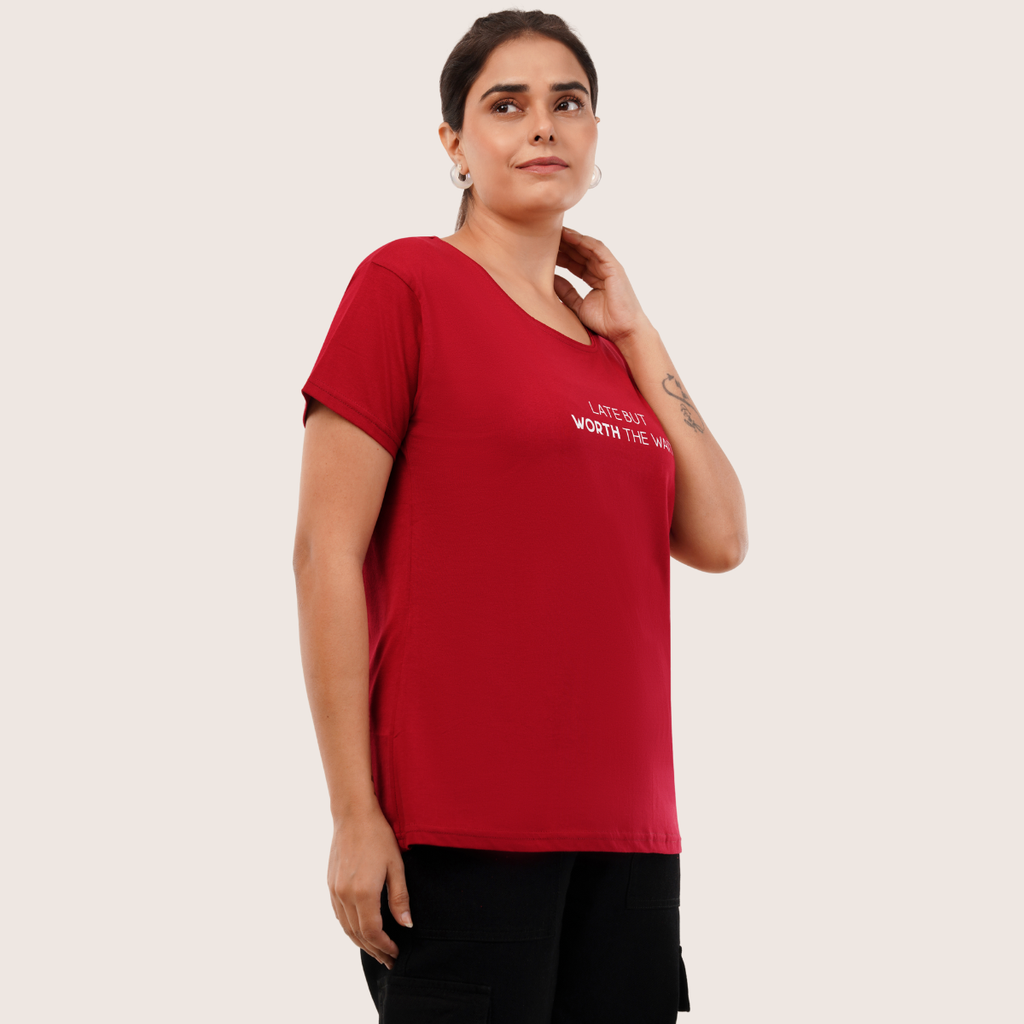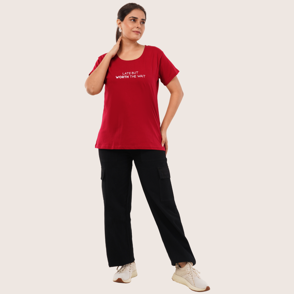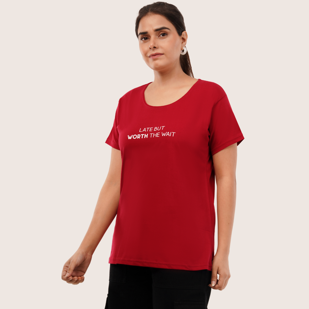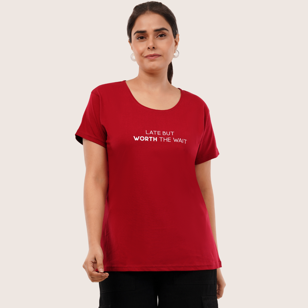 This stylish cotton T-shirt features a graphic design that captures the phrase 'fashionably late and worth the wait'. Durable and comfortable, the unique design makes this T-shirt a must-have for any wardrobe.