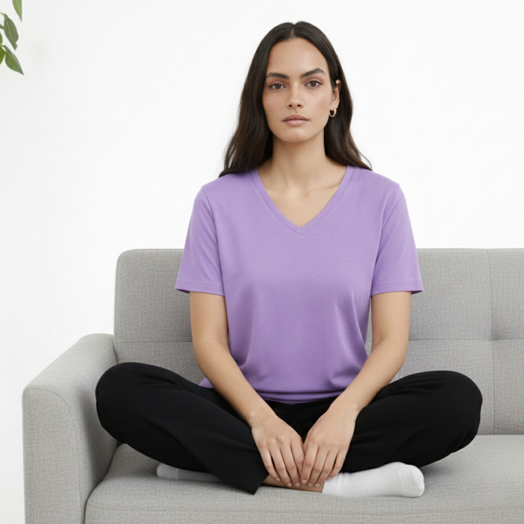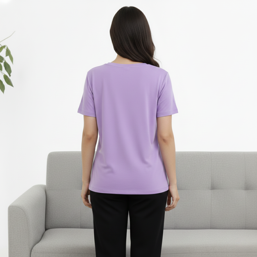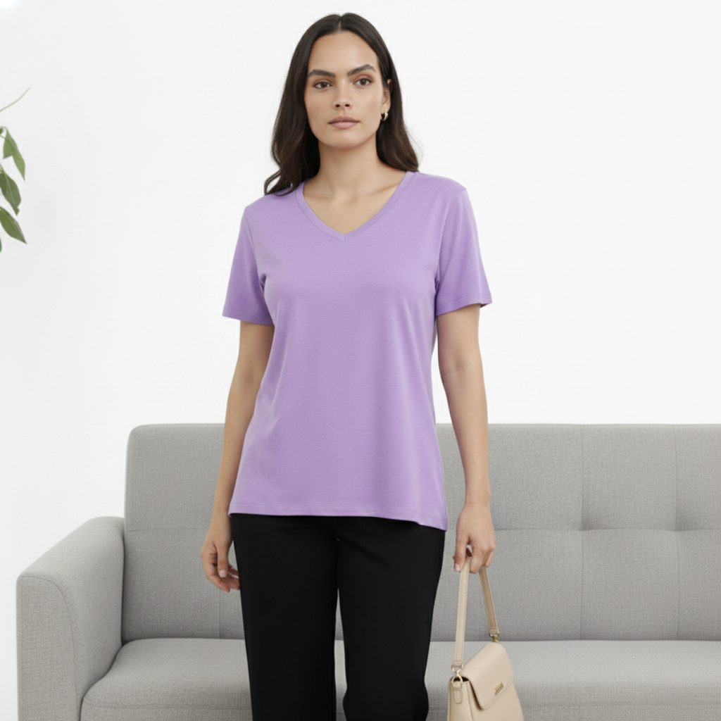 The Lavish Lilac Solid V-Neck T-shirt for Women offers exceptional all-day comfort, crafted with advanced biowash technology for a soft texture and enduring vibrant color that resists fading. Its breathable fabric allows for excellent airflow, keeping you comfortable throughout the day. The flattering V-neck design adds a touch of elegance, making it suitable for a variety of casual and semi-casual occasions. Combining durability with refined style, this t-shirt is an excellent choice for those seeking a blend of comfort, lasting quality, and effortless fashion in their everyday wardrobe essentials.