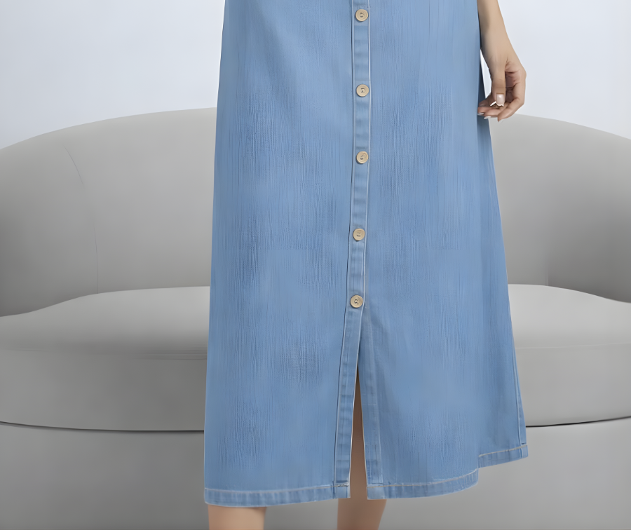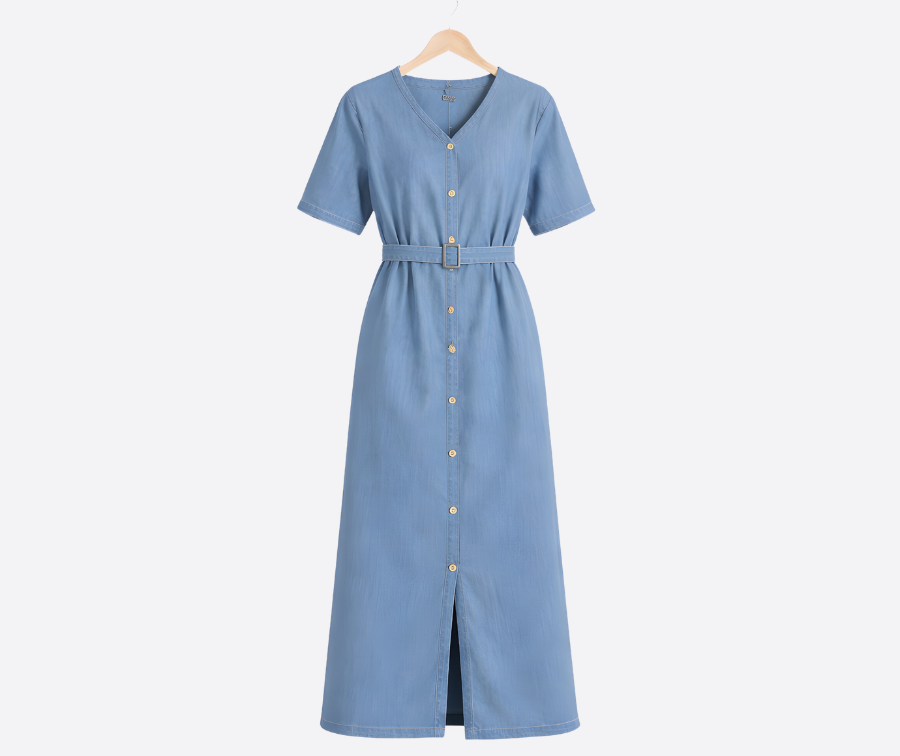 This Blue Denim Dress is crafted from 100% denim cotton, offering soft, breathable comfort for all-day wear. Featuring elegant sleeves, a V-neckline, and a front center slit, it combines classic style with practicality. The adjustable waist belt with buckle and buttoned back provide a tailored fit and added comfort. Equipped with a pocket, this versatile Western-inspired long dress suits work, brunch, shopping, or travel. Available in sizes M to 7XL, it effortlessly adds a stylish, trendy touch to your wardrobe while ensuring timeless elegance.