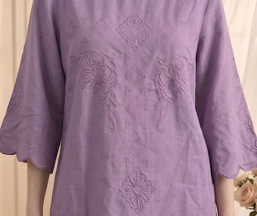 Embrace effortless summer style with the Lilac Bloom Cotton Embroidered Co-ord Set. Made from 100% breathable cotton, this lightweight piece keeps you cool and comfortable all day long. The top features delicate embroidery and flattering 3/4th sleeves with stylish edge detailing, while the straight-fit pants offer a modern silhouette with a convenient half-elastic waistband and two deep functional pockets. Soft and skin-friendly, this co-ord set is perfect for hot weather wear without compromising on elegance. The fresh pastel lilac tone brings a gentle, summery vibe to your wardrobe. Simply slip on and step out no styling required.