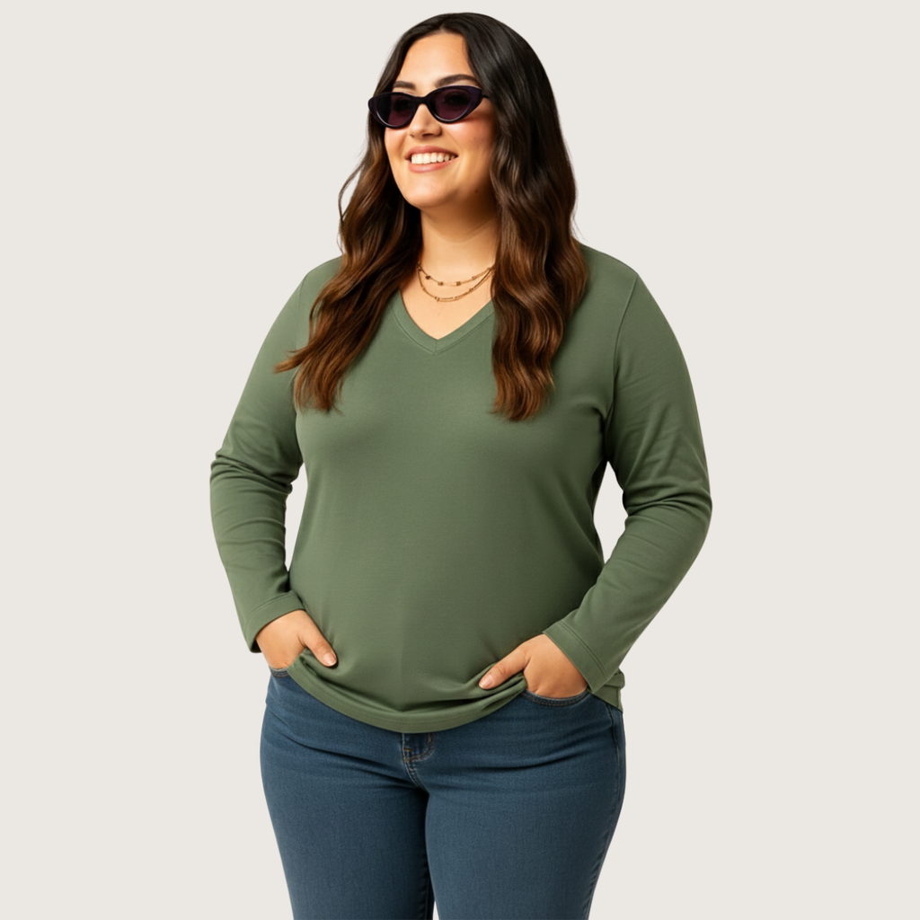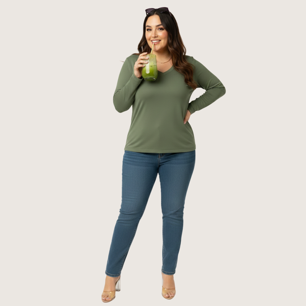 The Matcha Mint Full Sleeves V-Neck T-shirt features side slits and comes in a range of colors. Designed to provide a perfect fit that flatters all body shapes, it is crafted from soft, breathable fabric for all-day comfort. Available in sizes M to 7XL, its tailored silhouette gently accentuates natural curves. The sleek V-neckline and practical side slits offer a contemporary look with added mobility. Strong stitching ensures the T-shirt retains its quality and durability even after repeated washing. Combining comfort, accurate fit, and lasting strength, this T-shirt is a stylish and dependable choice for everyday wear.