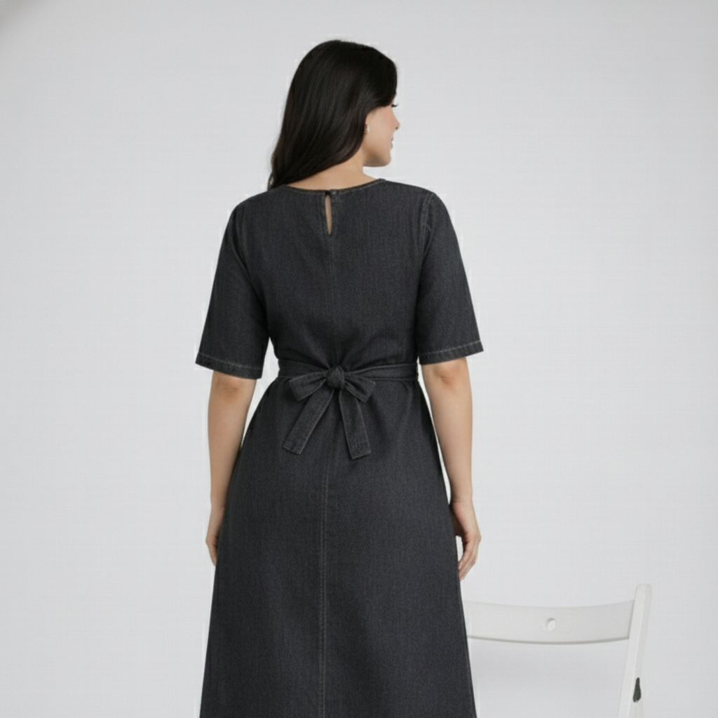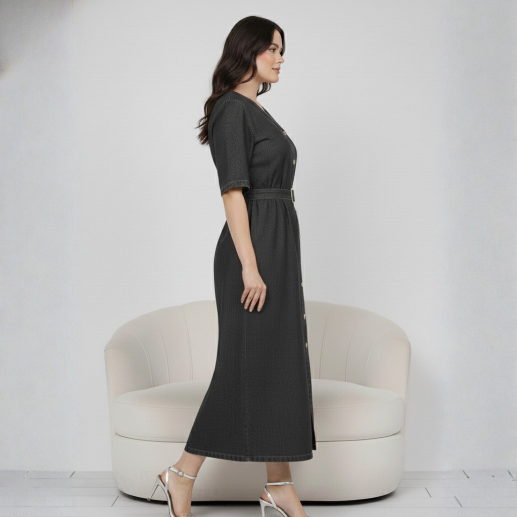 The Black Denim Dress is a versatile piece perfect for work, brunch, shopping, or vacations, available in sizes M to 7XL. Crafted from 100% denim cotton, it features soft, breathable fabric and elegant sleeves for all-day comfort suitable for any occasion. The classic, elegant design includes a V-neckline, front center slit and buttoned back for added style and ease. An adjustable waist belt with a buckle and a convenient pocket provides a flattering fit and practicality. This Western-inspired long dress adds a stylish, trendy touch to your wardrobe and is available in two additional colors.