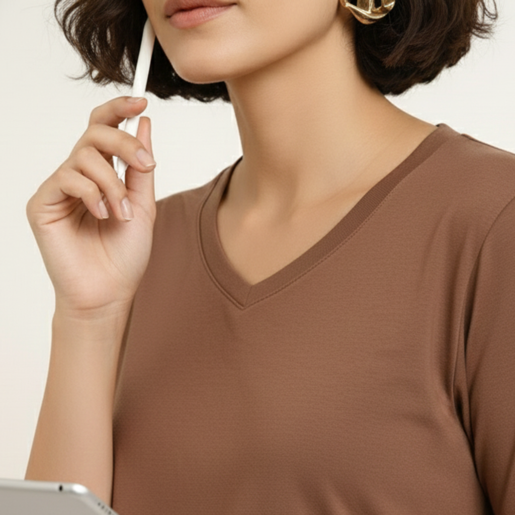 The Mocha Mousse V-Neck T-shirt features Pantone’s Color of the Year 2025, offering a regular fit with a precisely tailored neckline for a flattering silhouette. Crafted from 100% bio-washed cotton, this tee provides exceptional softness and durability while preserving its rich mocha shade. Its stylish design and comfortable fabric make it an excellent choice for those who value both current trends and lasting quality. Perfectly balancing fashion and functionality, the Mocha Mousse V-Neck is a versatile addition to any modern wardrobe.