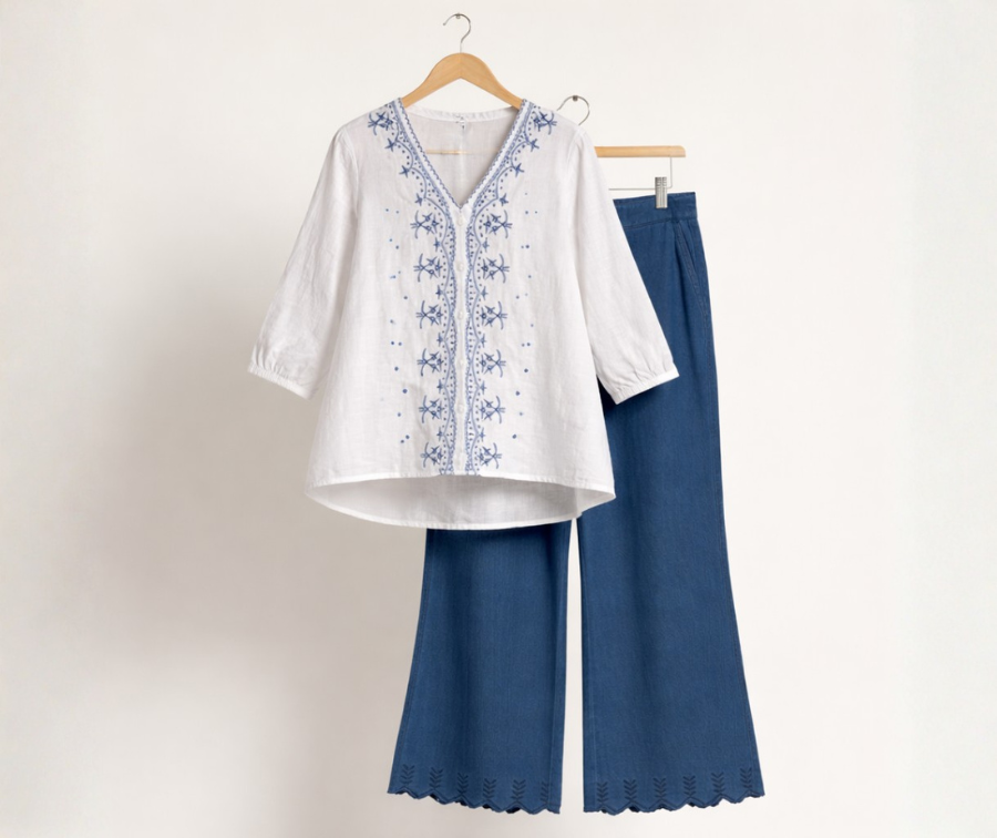 Navy Blue Embroidered Co-ord Set is made from 100% breathable cotton for all-day comfort. The soft, skin-friendly fabric keeps you cool and comfortable throughout the day. Designed with a straight-fit silhouette, it offers a clean and modern look. The half elastic waistband at the back ensures a comfortable fit, while functional side pockets add everyday practicality. Perfect for casual outings, work, or daily wear, these jeans are easy to style with any top. Available in 3 colors and sizes from M to 7XL, made to suit every body type.