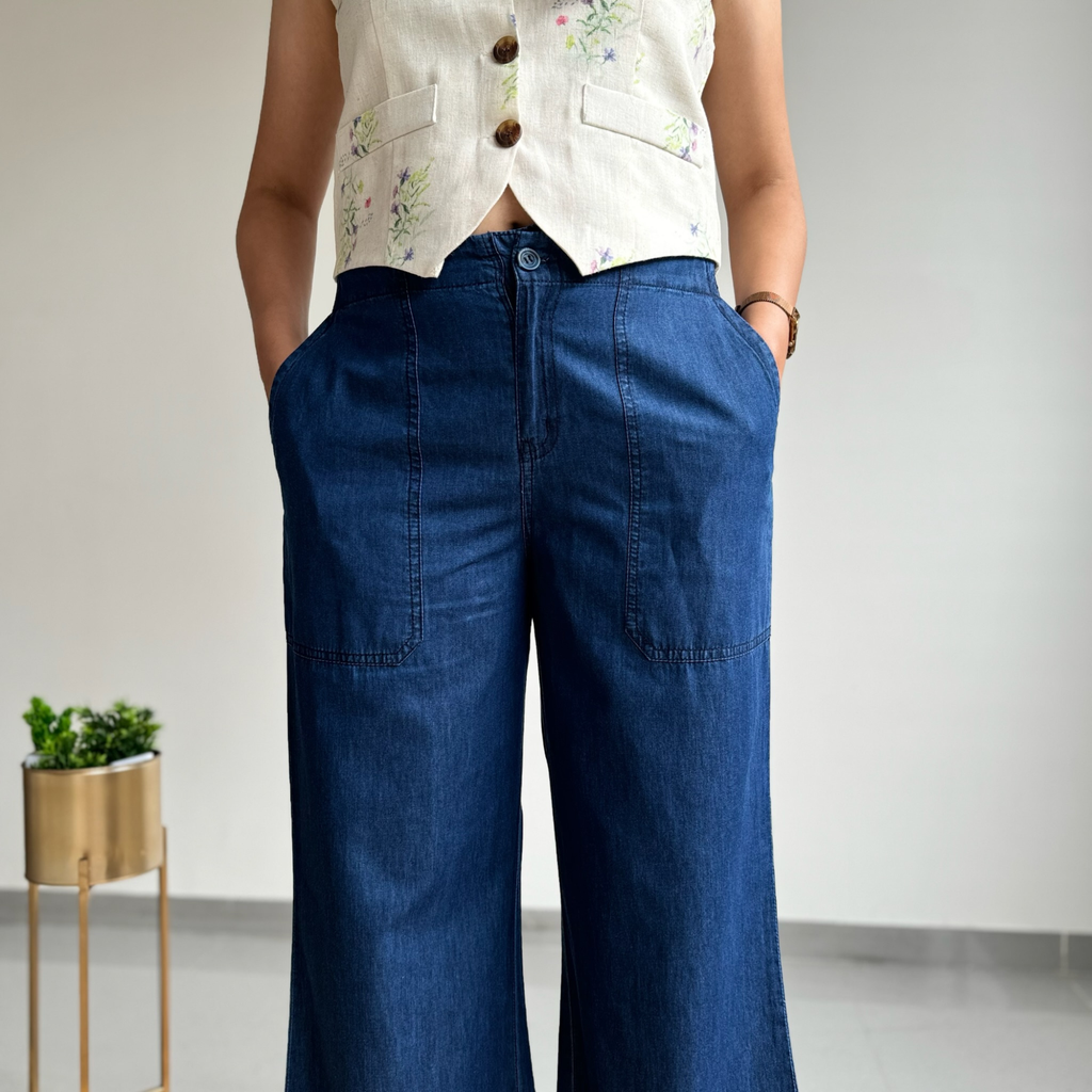 The Navy Blue Wide Leg Pants combine durable denim with expert craftsmanship to deliver a stylish and comfortable addition to your wardrobe. Made to retain their deep, rich color without fading, these pants feature intricate embroidery at the hemline, adding a refined element to everyday wear. Designed with all-day comfort in mind, their relaxed wide-leg fit allows ease of movement, while practical side pockets provide convenient storage for essential items. Ideal for travel and casual occasions, these pants perfectly balance fashion and functionality. Available in inclusive sizes, they serve as a versatile, reliable choice for a modern, sophisticated wardrobe.