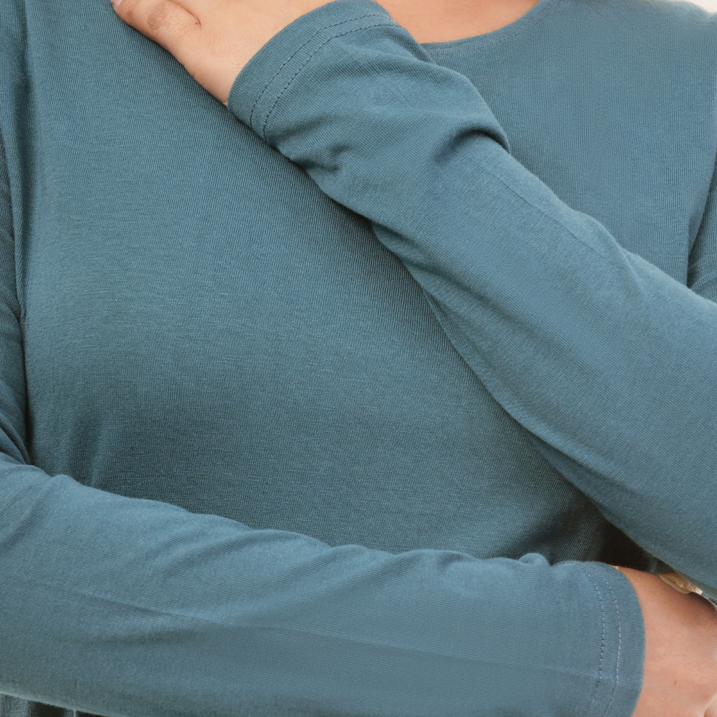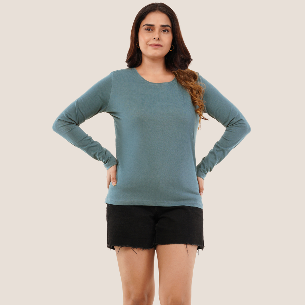 The Peacock Teal Full Sleeves Solid T-shirt for Women stands out with its vibrant, captivating color that adds a fresh touch to any outfit. Made entirely from 100% bio-washed cotton, this t-shirt ensures exceptional softness and breathability, providing lasting comfort throughout the day. Its classic round neck design offers a timeless look that pairs well with various styles, making it an ideal choice for casual and semi-casual occasions alike. Durable and easy to care for, this versatile piece seamlessly blends comfort with style, making it a reliable addition to your everyday wardrobe essentials.