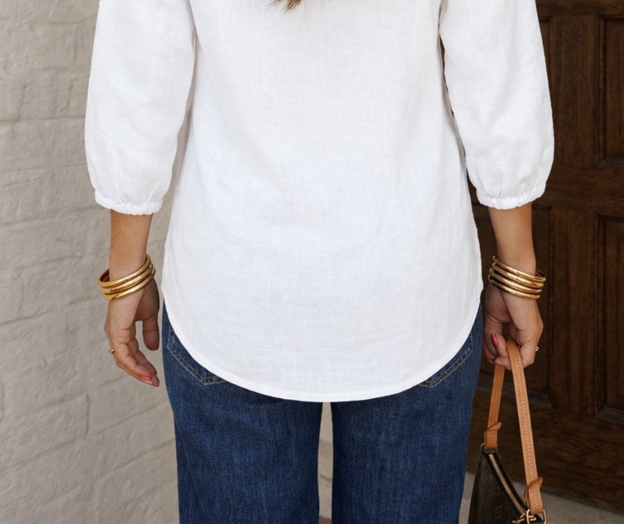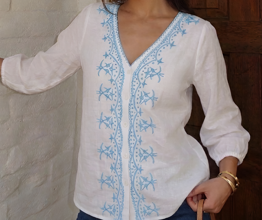 White & Sky Embroidered Cotton Top is your go-to piece for effortless summer style. Made from 100% breathable cotton, it keeps you cool and comfortable all day while remaining soft and skin-friendly for daily wear. This elegant top features delicate hand-inspired embroidery detailing on the front. The relaxed fit silhouette with a stylish V-neckline flatters your frame, while the 3/4th sleeves provide the perfect balance of coverage and breathability. Pair it with shorts, linen pants, or a skirt for an instantly polished look.